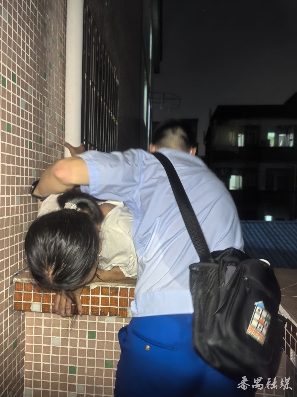当晚8时30分左右,网格员梁某、吴某在石壁街都那村南路十巷一栋出租屋进行巡查,当巡查至该出租屋三楼时,听到阳台传来呼救声,于是立即顺着呼救声的方向查看,发现一名女子被困在阳台外沿。
